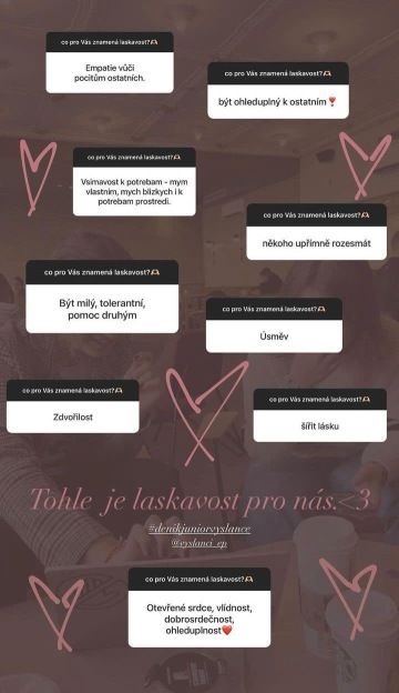 - “Podle mě je to strašně důležité, protože když se vám takhle jenom z ničeho nic stane nějaká laskavost, tak vám to prostě zlepší náladu nejvíc. I když je to třeba bez nějakého hlubšího důvodu a je to jenom kvůli té laskavosti tak to je podle mě nejlepší.”