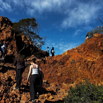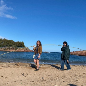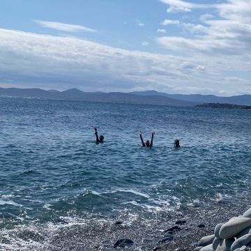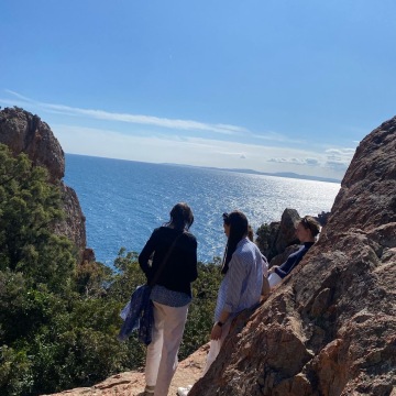 Dnes jsme se vypravili do divočiny, k rudým skaliskům a rozeklaným útesům dramontského pobřeží (od Saint-Raphael co by kamenem dohodil, tj. 17 minut busem ). Na pláži plné hebkých oblázků i masivních šutrů to někteří z nás déle nevydrželi a pod dohledem vševidoucích pedagogů se pohroužili do svěžích vod .