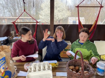 Potom jsme se rozdělili na skupinky a vykonávali práce všeho druhu: zakládání záhonků, ochutnávku mladého česneku, opečovávání vajíček a výběhu pro krávy.