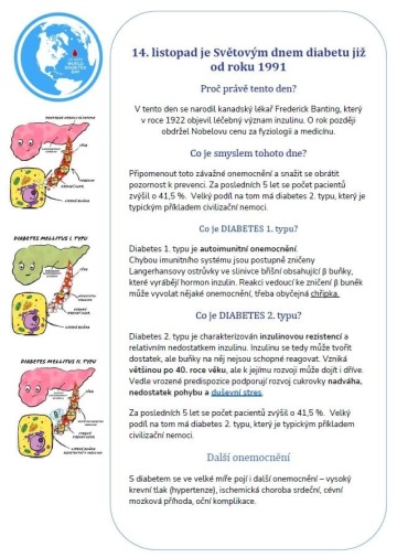 V listopadu jsme si připomněli další významný den týkající se našeho zdraví. 14. listopad je věnován velmi rozšířenému onemocnění Diabetes mellitus, známému také jako CUKROVKA. I na naší škole máme studenty s tímto onemocněním. V rámci projektu týkajícího se lidského těla jsme toto téma otevřeli, představili a sdíleli zkušenosti našich studentů.